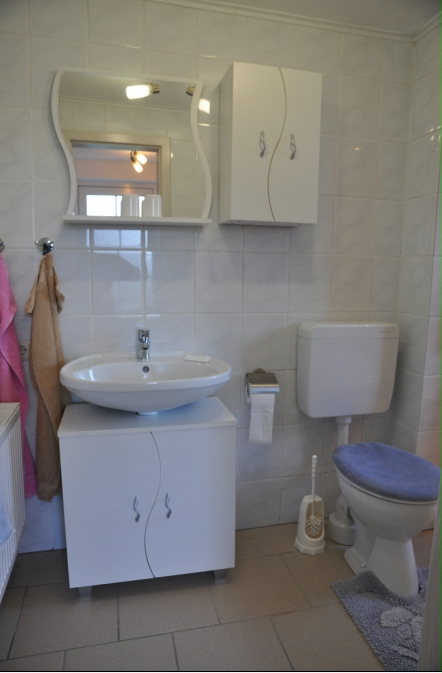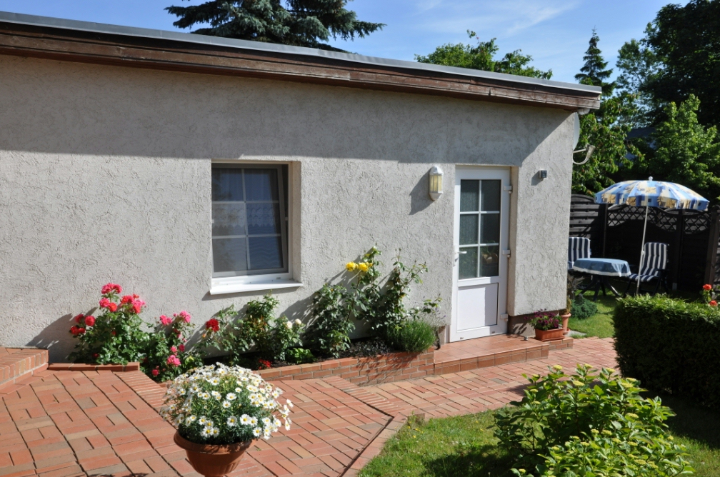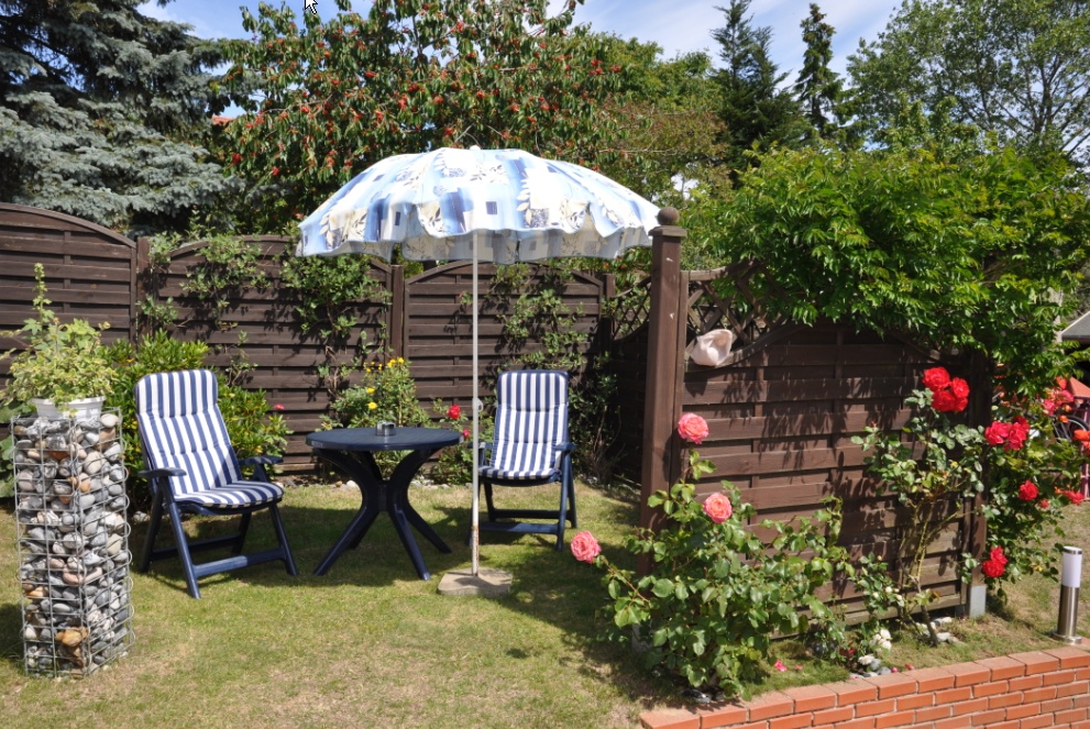 - WC / Dusche, Rasenfläche mit Gartenmöbel.