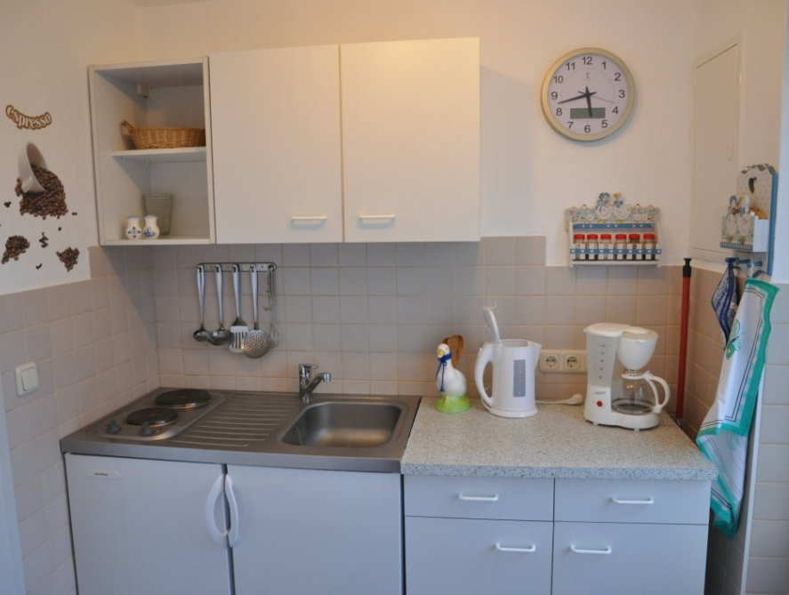 - Kühlschrank, Kaffeemaschine, Wasserkocher, Toaster, Geschirr.