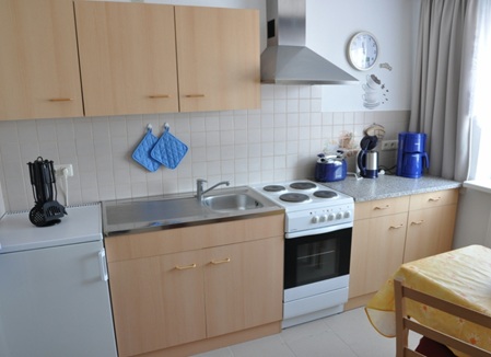 50 qm, Wohnzimmer, Schlafzimmer, Wohnküche mit Herd und Backofen.
